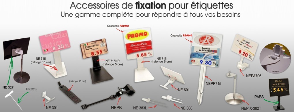 Accessoires de fixation pour étiquettes alimentaire Charcuterie et pique-prix. Notre large gamme d'accessoires vous assurera polyvalence et facilité de disposition de vos étiquettes dans votre étal de charcuteries, salaisons et produits frais : pique inox ou plastique, pied, pince, clip, pose à plat...sans oublier que tous nos accessoires sont amovibles pour vous permettre un nettoyage facile et rapide.