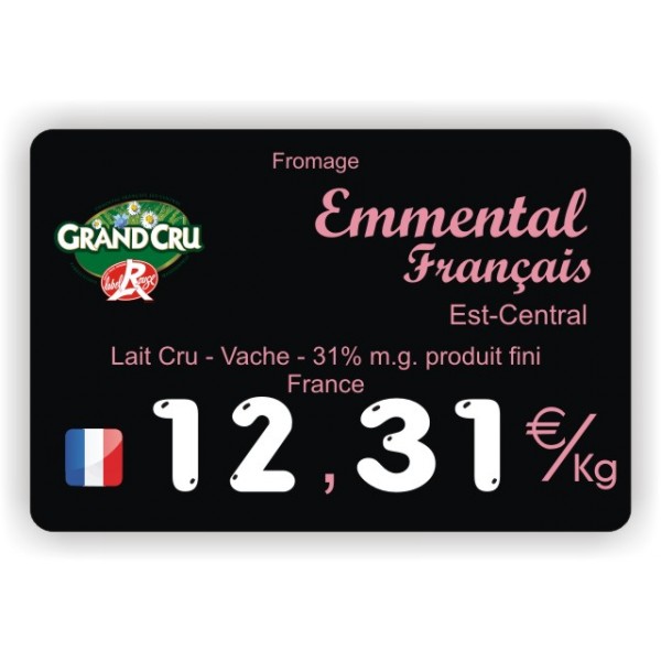 Etiquette en plastique ABS alimentaire de 2mm d'épaisseur disponible en 2 formats (90x60mm ou 100x70mm) avec impression haute qualité à l'encre couleur du décor. Le titre personnalisé est disponible en 2 polices d'écriture au choix. L'étiquette est livrée pré-percée pour recevoir des chiffres à picots (vendus en option et disponibles en bleu, blanc, rouge, noir ou jaune) et pré-imprimée avec l'unité de vente Prix EUR/Kg ou EUR/Pce. La queue d'aronde moulée au verso de l'étiquette permet la fixation avec nos nombreux accessoires dédiés (pied, support, ergot etc.).